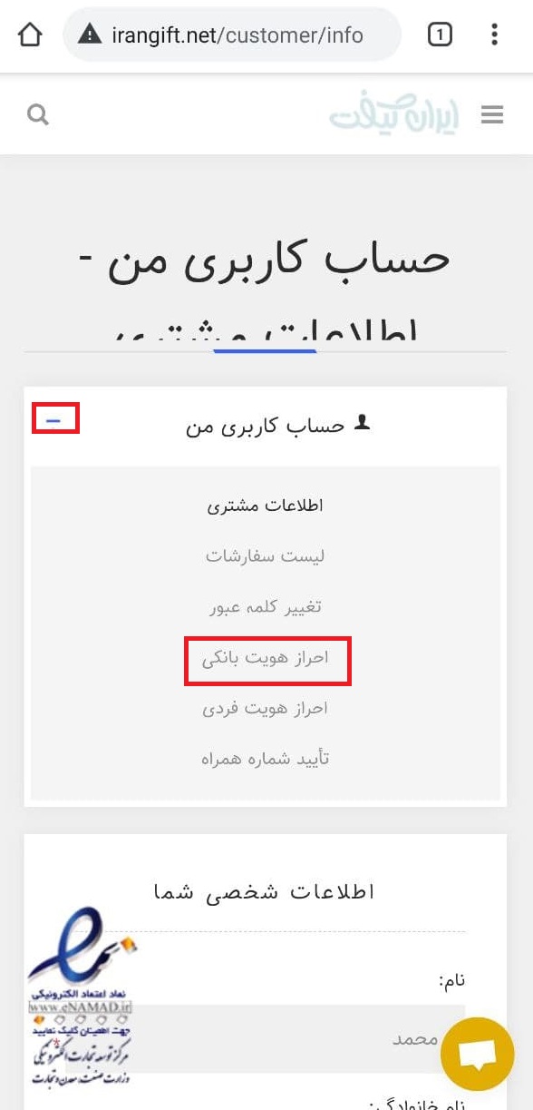 برای انجام این کار مجددا وارد قسمت حساب کاربری من شوید و با زدن گزینه ی مثبت بخش احراز هویت بانکی را انتخاب کنید.