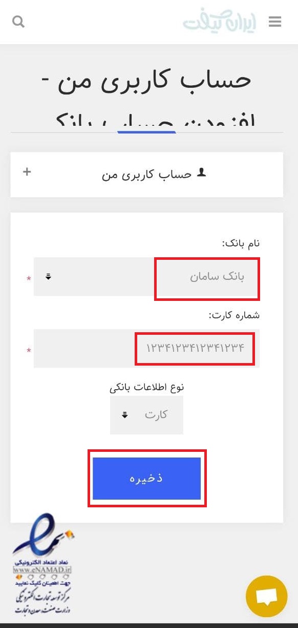 شماره کارت و نام بانک خود را وارد نمایید و سپس گزینه ی دخیره را بزنید.