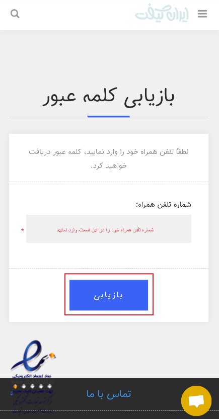 در صفحه بعدی که باز میشود شماره تماسی که با آن ثبت نام نموده اید را در قسمت مربوط وارد نمایید و سپس گزینه ی بازیابی را بزنید