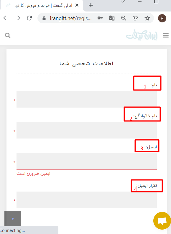 سپس اطلاعات لازم(طبق تصویرپایین) رابه صورت صحیح وارد نمایید . این اطلاعات شامل (نام، نام خانوادگی، ایمیل و تکرار ایمیل می باشد)