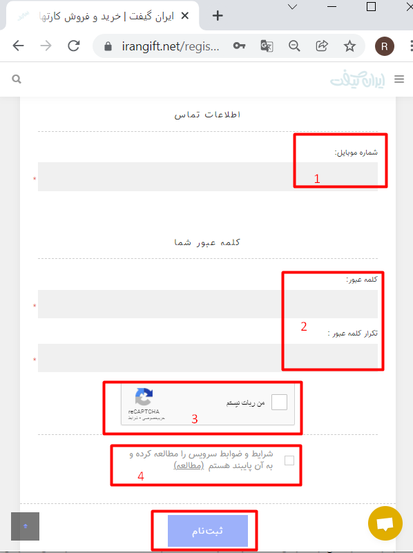 و در نهایت گزینه ی "قبول شرایط و ضوابط" را انتخاب کنید. (توجه داشته باشید که با انتخاب این گزینه قوانین و مقررات سایت را مطالعه و موافقت خود را با این ضوابط اعلام می نمایید.)