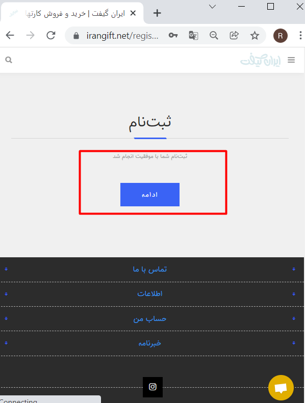 پس از موفقیت در ثبت نام اولیه (تصویر پایین) برای تکمیل اطلاعات بر روی گزینه ادامه، کلیک نمایید