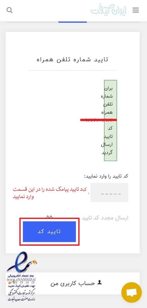 بعد از انجام ثبت نام شماره تماسی که با آن ثبت نام کردید باید تایید شود کد تایید به صورت خودکار به شماره تلفن شما پیامک می گردد، کد را در قسمت مربوط وارد و تایید را انتخاب نمایید.